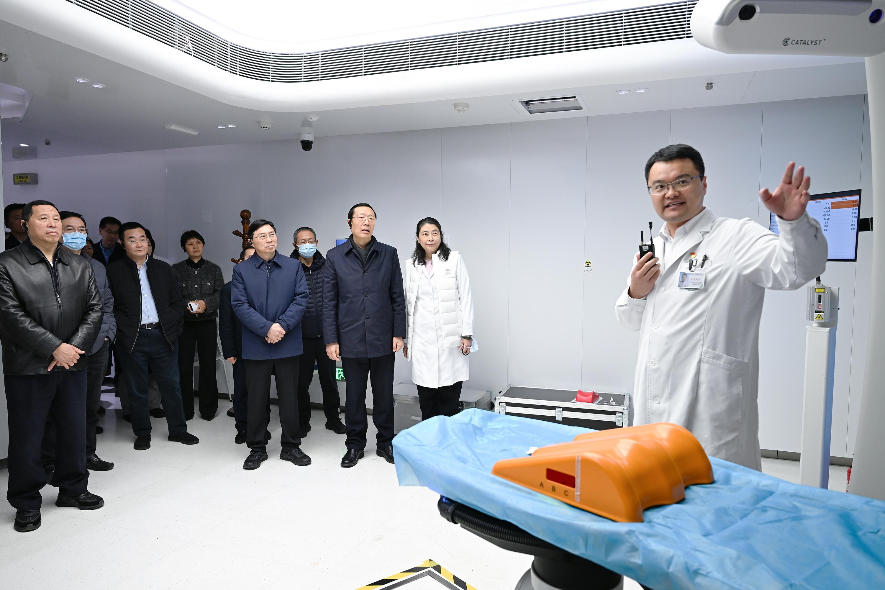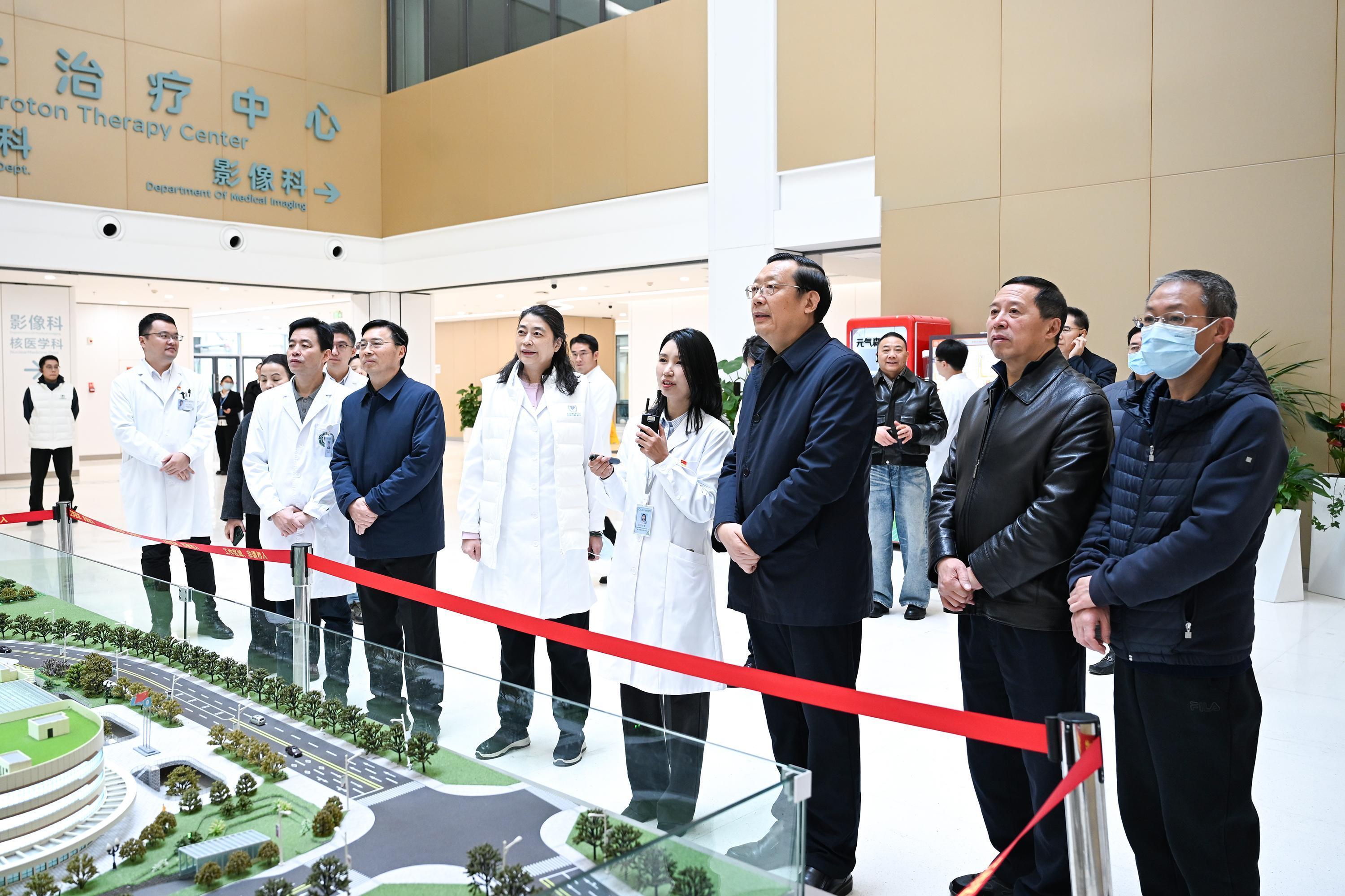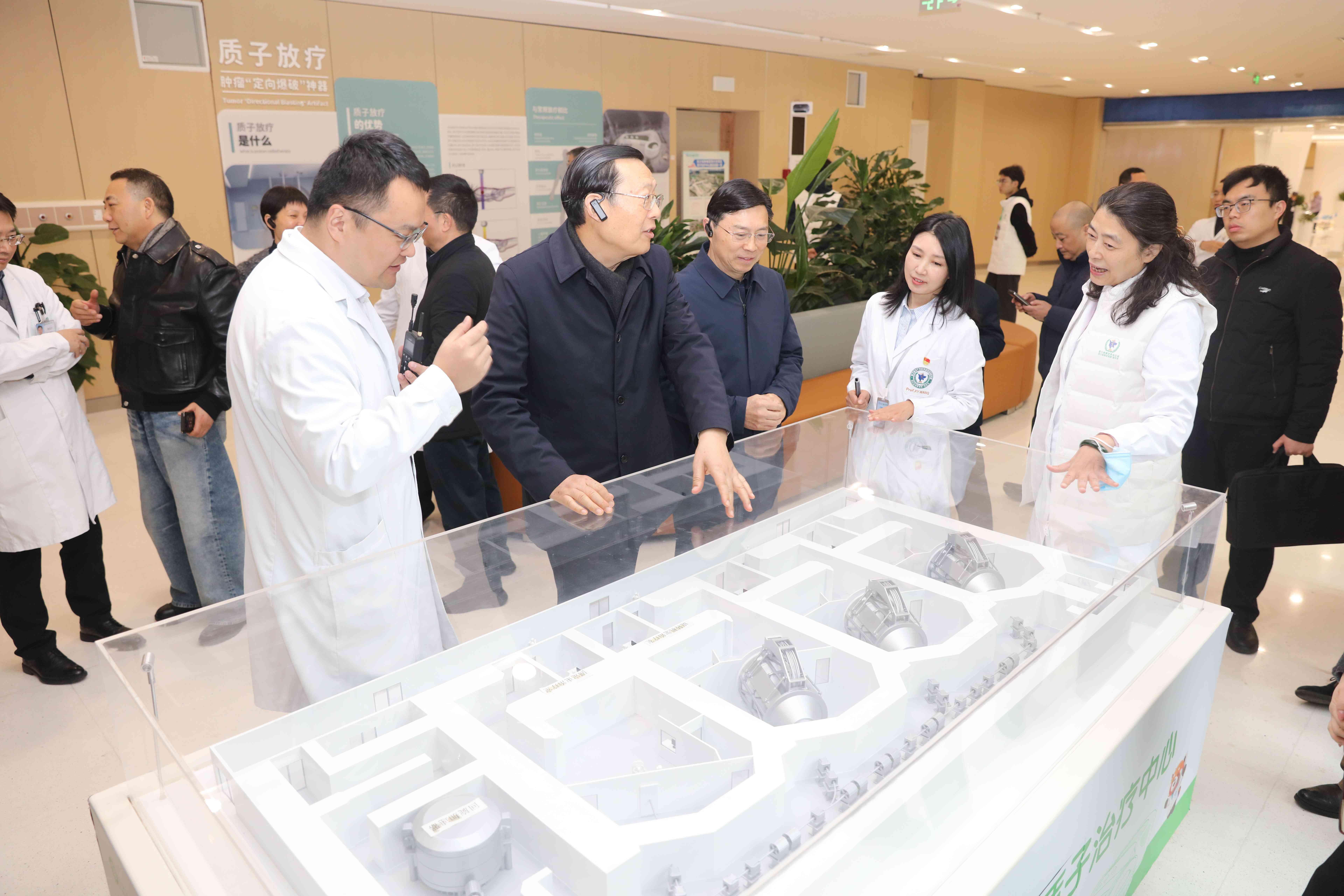 随后,调研组来到医院质子治疗中心,了解关于质子治疗技术原理、临床优势、设备运行及在肿瘤精准治疗领域应用等情况。张剡一行重点考察了医院为提升区域疑难重症救治能力而开展的尖端诊疗技术。