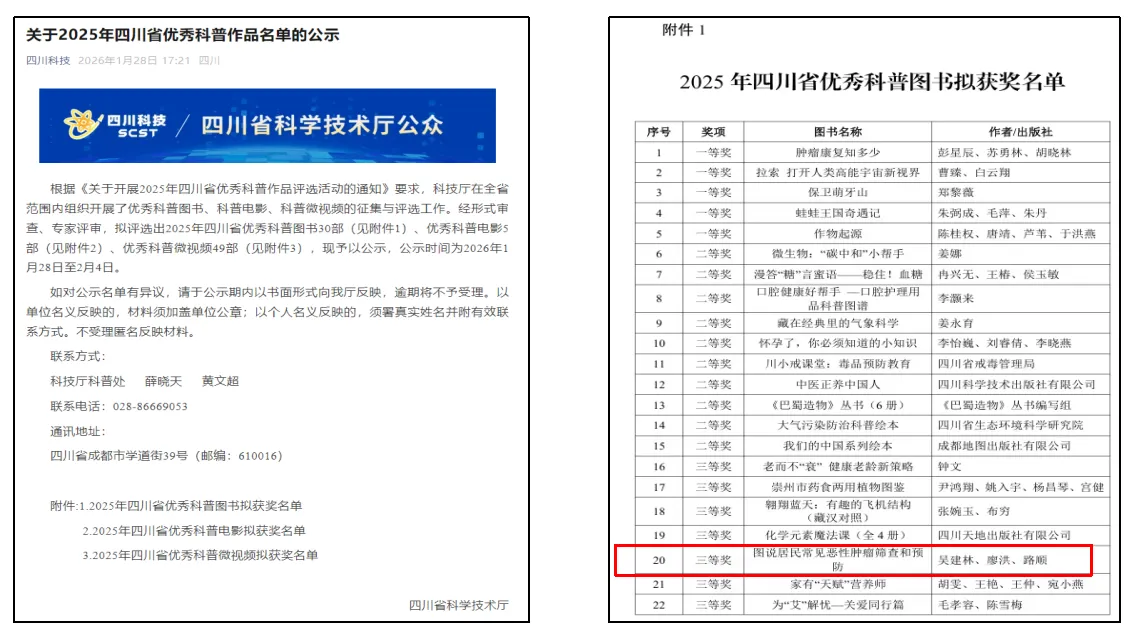 近日,由四川省科学技术厅组织开展的“2025年四川省优秀科普作品评选活动”结果揭晓。四川省肿瘤医院组织编写的科普漫画图书《图说居民常见恶性肿瘤筛查和预防》凭借其鲜明的原创性、严谨的科学性、生动的通俗性与广泛的社会影响力,在众多参评作品中脱颖而出,荣获优秀科普图书三等奖。